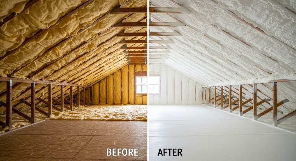 Traditional fiberglass allows air infiltration, while spray foam creates a complete thermal barrier.